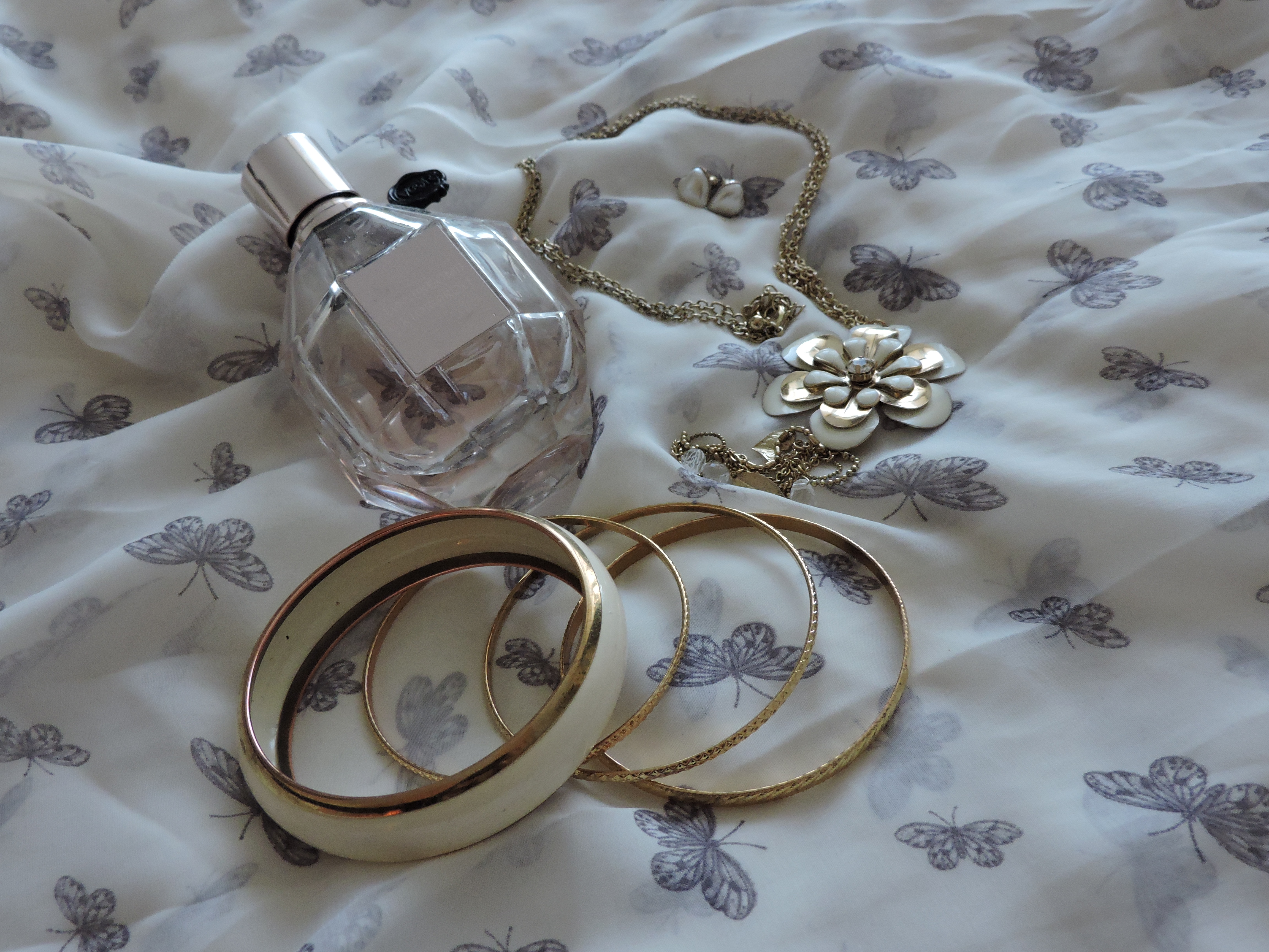 As I said before, I like to travel light, so I bring very little jewellery with me on holidays. I normally go for a neutral set like these cream bangle set, long cream flower necklace and pearl heart-shaped earrings.They go with almost everything.
